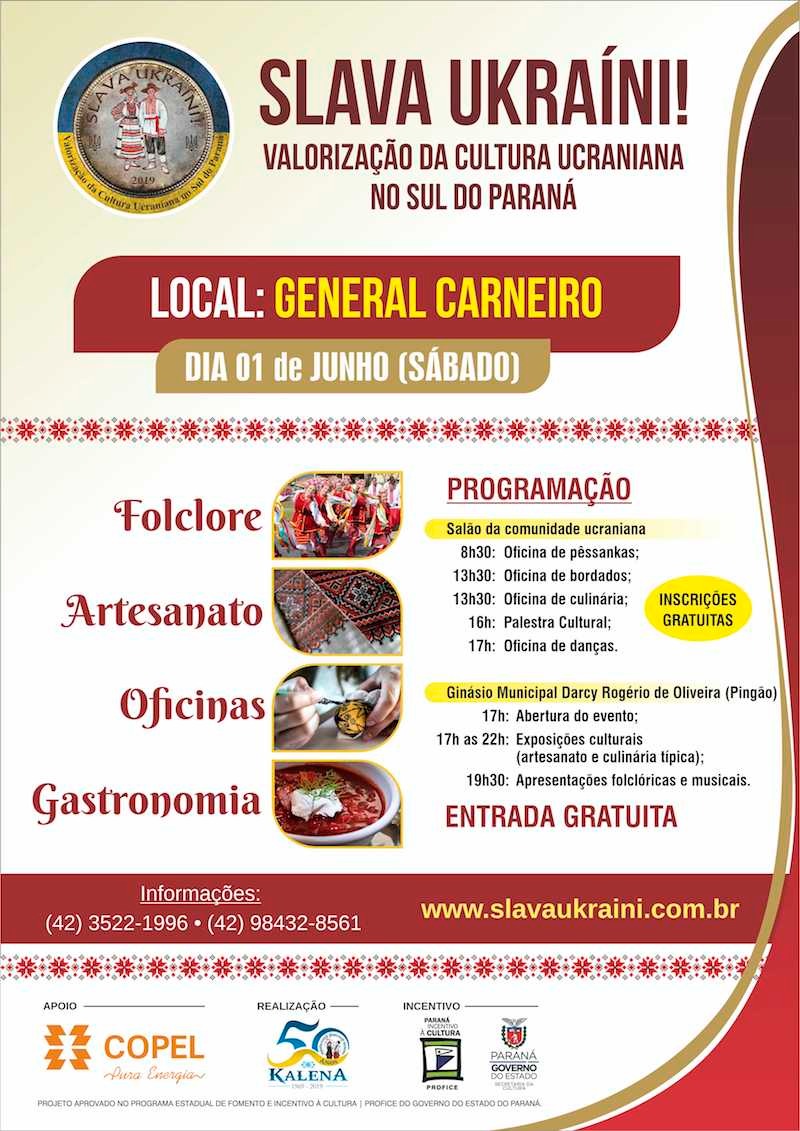 General Carneiro-PR recebe o evento “Slava Ukraini" Valorização da Cultura Ucraniana no Sul do Paraná 28 mai, 2019 CULTURA General Carneiro-PR recebe o evento “Slava Ukraini! Valorização da Cultura Ucraniana no Sul do Paraná” Quinta Edição do projeto executado pelo Folclore Ucraniano Kalena acontece dia 01/06/19 na cidade de General Carneiro. O “Slava Ukraini!” promove ações de valorização da cultura ucraniana através da transmissão de saberes tradicionais em oficinas e palestras, e um grande evento cultural com as manifestações artísticas da cultura ucraniana. O evento conta com o apoio da COPEL e incentivo do PROFICE – Programa de Fomento e Incentivo à Cultura do Estado do Paraná. PROGRAMAÇÃO: A primeira atividade na quinta-feira que antecede o evento, com a realização da oficina de danças que será ministrada pelo Prof. Tadeu Ribeiro dia 30/05, as 17h30 no Salão da Igreja Ucraniana. No sábado dia 01/06, a programação inicia de manhã com a oficina de pêssankas, ministrada por Vilson José Kotviski. Logo após o almoço, acontecem simultaneamente as oficinas de culinária com coordenação de Cecilia Nagurnhak Kotviski, e a oficina de bordados com Efrozena Melnechenko, e ainda a tarde acontece a palestra sobre a valorização da cultura ucraniana com Daniel Sliwinski, atividades que acontecem também no Salão da Igreja Ucraniana. A partir das 17h30 no Ginásio Municipal “Pingão” estará aberta a Exposição Cultural, com a praça gastronômica com pratos da culinária ucraniana e também a exposição de artesanato com pêssankas, bordados e porcelanas. E as 20h iniciam as apresentações artísticas com as danças folclóricas e músicas ucranianas, com entrada gratuita. Confira o Flyer do evento: APOIO: RÁDIO CULTURA FM 87,9 MHz