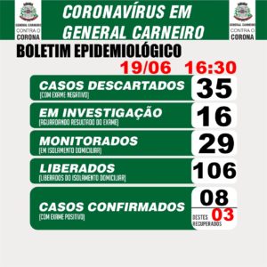ALERTA - chega a 08 os casos de Covid-19 em General Carneiro Segundo a Secretaria Municipal de Saúde, os dois novos casos têm relação com os últimos três casos. 19 jun, 2020 CIDADE A Secretaria Municipal de Saúde de General Carneiro confirmou na tarde desta sexta-feira (19) dois novos casos de coronavírus no município. Com esses, o número de pacientes com o vírus chega a 08. De acordo com a Secretária Municipal de Saúde, Rhamayane Neubauer, os dois novos casos estão relacionados aos outros três casos, pois os pacientes possuem grau parentesco e tiveram contato direto com caso confirmado. Segundo o boletim atualizado nesta sexta-feira, 16 casos estão em investigação, 01 internado e três curados.