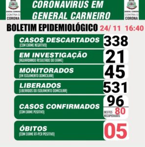 General Carneiro registra mais uma morte por Covid-19 Essa é a quinta morte por Covid-19 registrada no município. 24 nov, 2020 CIÊNCIA E SAÚDE Infelizmente foi confirmado na tarde desta terça-feira (24) pela Secretaria Municipal de saúde de General Carneiro mais uma morte causada pelo coronavírus, a paciente de 48 anos era merendeira da Creche Eresmira dos Anjos Ferreira e estava internada na UTI do Hospital São Camilo em União da Vitória veio a óbito totalizando cinco mortes pela doença no município. A confirmação da morte foi informada pelo município através do novo boletim epidemiológico e repassado ao portal da prefeitura (www.generalcarneiro.pr.gov.br). A rádio Cultura deixa os mais sinceros sentimentos a família enlutada. Além da morte a Secretaria de saúde confirmou mais um caso de Covid-19, se tratando de uma mulher entre 20 e 30 anos que está em isolamento domiciliar sendo acompanhada por uma equipe de saúde. Segue abaixo o boletim epidemiológico atualizado.