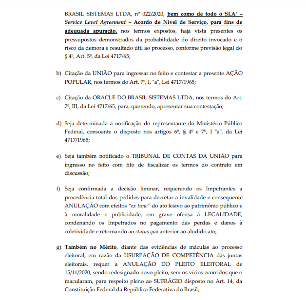 Ação popular movida por 500 advogados pede anulação das eleições municipais O grupo questiona a contratação sem licitação da empresa que forneceu o “supercomputador” que apresentou lentidão na apuração do primeiro turno, em 15 de novembro 02 dez, 2020 POLÍTICA - CIDADES (Foto: Antonio Augusto/Ascom/TSE) O Movimento Advogados do Brasil (MABr) entrou com uma ação popular contra o Tribunal Superior Eleitoral (TSE) em que requer, de forma liminar, a anulação das eleições municipais deste ano e a designação de uma nova data. A peça jurídica é assinada por sete coordenadores nacionais do movimento e subscrita por 501 advogados filiados. Segundo eles, o objetivo da medida é “defender a moralidade pública, o respeito às leis e evitar prejuízo ao erário público”. O grupo questiona a contratação sem licitação da empresa que forneceu o “supercomputador” que apresentou lentidão na apuração do primeiro turno, em 15 de novembro. O MABr alega que o contrato pode causar um "prejuízo aos cofres públicos de quase R$ 18 milhões". O movimento ainda questiona a decisão do TSE de centralizar a apuração e totalização de votos no próprio Tribunal. Segundo o grupo, a medida violou o artigo 158 do Código Eleitoral, que determina que a apuração de prefeitos e vereadores tem que ser feita pelas juntas eleitorais de cada estado da federação. A ação foi protocolada na 6ª Vara Federal Cível do Distrito Federal. CLIQUE AQUI E ACESSE O DOCUMENTO COMPLETO. (Trecho do documento) Fonte: Gazeta do Povo