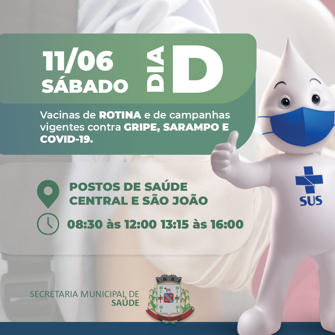 Secretaria Municipal de Saúde promove “Dia D” de vacinação. As vacinas ocorrerão nos postos de saúde Central e São João 09 jun, 2022 CIDADE A Secretaria Municipal de Saúde promoverá, neste sábado, 11 de junho, mais um “Dia D” de vacinação. No momento, os munícipes terão a oportunidade de verificar as suas vacinas e colocá-las em dia. As vacinas ocorrerão nos postos de saúde Central e São João, das 08h30 às 12h00 e 13:15 às 16h00. Ocorrerão aplicações das vacinas contra Gripe, Sarampo, COVID-19 e vacinas de rotina