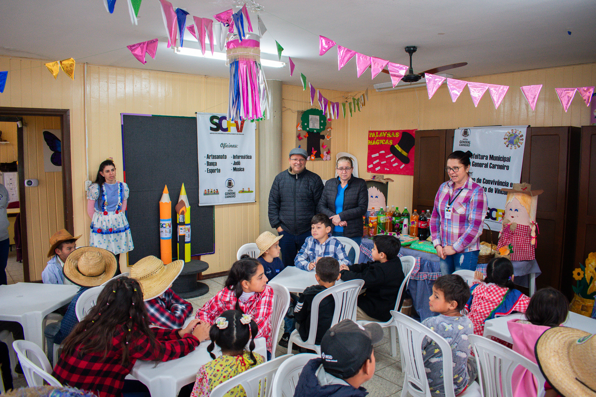 Arraiá do Projeto Piá confira mais sobre o dia especial para as crianças do SCFV. 26 jun, 2023 CIDADE As crianças do Serviço de Convivência e Fortalecimento de Vínculos foram recepcionadas com um dia muito especial para celebrar as festividades do mês de junho. A Festa Junina do SCFV – Projeto Piá, teve direito à pipoca, cachorro-quente, pastel e bolo. “Esses são detalhes que fazem diferença para as crianças. Através das nossas oficinas, realizamos toda essa decoração com materiais reciclados, trabalhando também a sustentabilidade. Nossos alunos estão sempre aprendendo coisas novas, alguns inclusive com a intenção de comercializar seus produtos. Estamos muito orgulhosos com o andamento do projeto”, comenta a diretora, Liliane Charnoski. O prefeito, Joel Ferreira, o vice-prefeito, Celio Garbin, e a secretária de Assistência Social, Janete Weber, estiveram presentes no momento. “O nosso Projeto Piá é um grande orgulho pra General Carneiro. Tudo está muito lindo. Acompanhamos as apresentações artísticas e os produtos em diversos eventos e sempre ficamos admirados. Parabéns a diretora Liliane, aos oficineiros e a todas as crianças”, comenta o prefeito. “Agradeço imensamente, junto com o prefeito, vice e secretária, à Maria Célia e a Kely, pelas comidas deliciosas, e aos responsáveis pelo artesanato: Dani, Ciskos, Deise, Fernando, Alan e Lucas. Tudo estava lindo”, reforça a diretora.