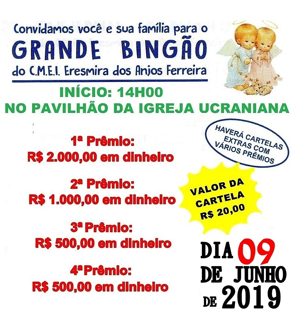 CMEI Eresmira dos Anjos Ferreira promove bingão Grande bingão 17 mai, 2019 CIDADE O CMEI Eresmira dos Anjos Ferreira do bairro Planalto em General Carneiro PR irá promover um grande bingão em prol de fundos para gastos essenciais da própria unidade. Irá ter 4 prêmios principais, que são: 1°: R$ 2.000,00 em dinheiro 2°: R$ 1.000,00 em dinheiro 3°: R$ 500,00 em dinheiro 4°: R$ 500,00 em dinheiro Havendo cartelas extras com muitos outros prêmios. O evento será realizado dia 09 de junho no pavilhão da Igreja Ucraniana São Miguel Arcarno, as 14:00h. O CMEI convida a todos para prestigiarem esse evento, e desde já agradece o apoio da comunidade.